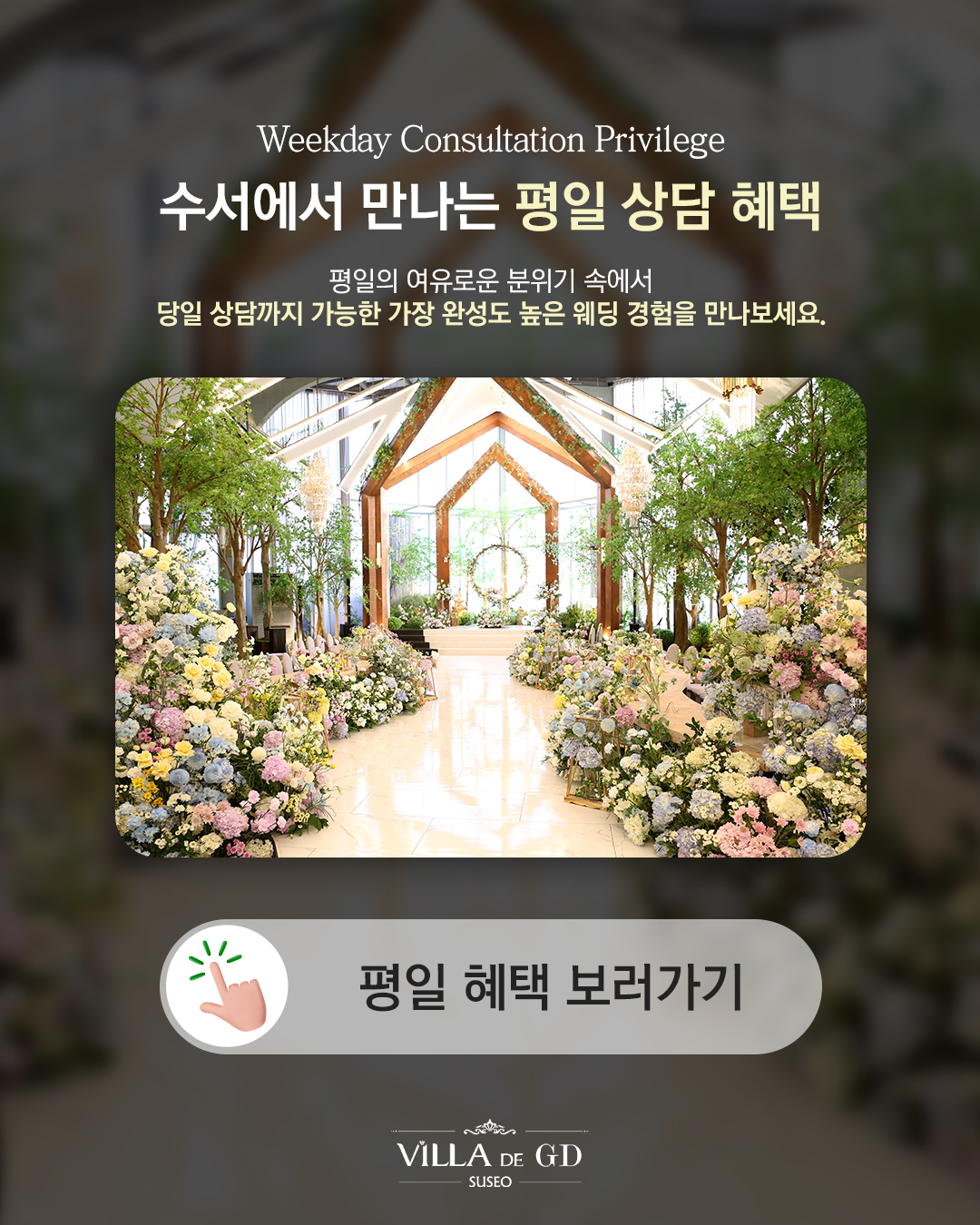 웨딩스토리가 진행되는 동안에는 빌라드지디 수서에서만의 한적함을 느낄 수 있습니다.